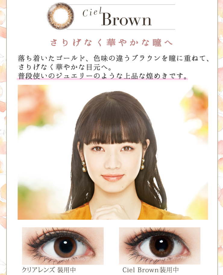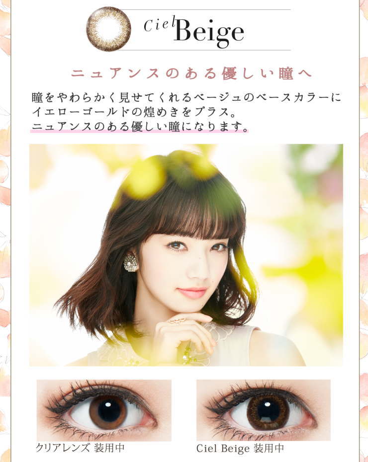 <シエルグレージュ/シエルベージュ> ・Outside Color·········瞳を自然に強調するドットデザイン ・Base Color············瞳と重なり透明感のある雰囲気へ ・Twinkle Color·········優しく煌めき華やかな印象へ <シエルブラウン/シエルグリーン> ・Outside Color·········瞳を自然に大きく見せるドットデザイン ・Middle Color··········瞳と重なり奥行のある雰囲気へ ・Inside Color··········きらめきをプラスしさりげなく華やかな印象へ ◆こだわりポイントその2····見た目がナチュラルに見えるこだわりのデザイン <シエルグレージュ/シエルベージュ> ・外周部のドットをあえて不規則に配置することで黒目のフチを再現。