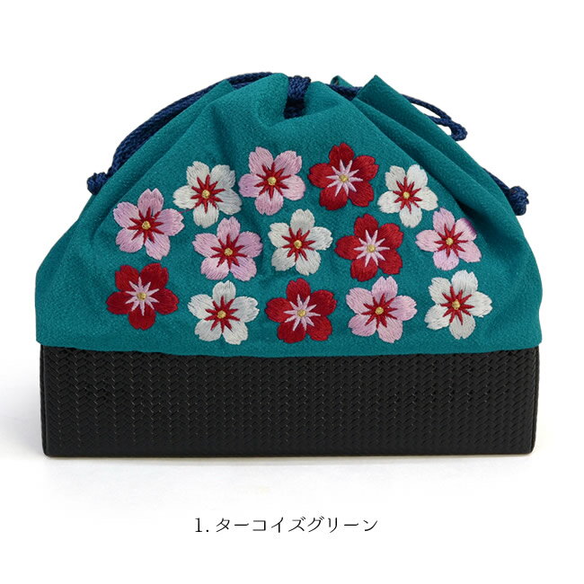 袴巾着 ちりめん桜刺繍 全4カラー ターコイズ 赤 白 黒 メール便不可 あす楽サイズ(約):横22cm×マチ11.5cm×高さ16cm内ポケット(1箇所):(約)縦9.5cm×横14.5cm表地:ポリエステル100% 刺繍糸:ポリエステル100% 裏地:ポリエステル85%、綿15% 底部分:合成皮革企画:日本、製造:中国 ※この製品は、中国における日本企業の工場で製造されたものです。
