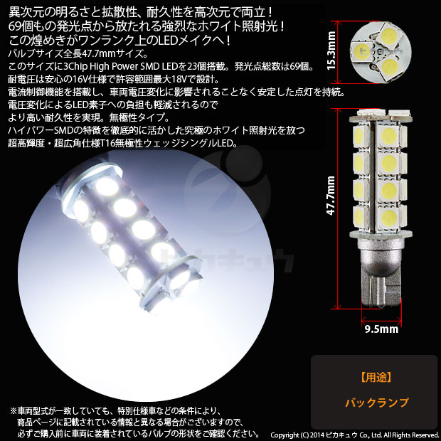 ピカキュウ,LED専門店ピカキュウ,LEDバルブ,SMD,LED,T16,3Chip High Power SMD 23連ウェッジシングル球,LEDカラーホワイト,バックランプ,発光点69個,耐電圧16V,MAZDA,マツダ, AXELA,アクセラ, SEDAN,セダン, SKYACTIV-G,スカイアクティブ, 15S,BM5FP対応