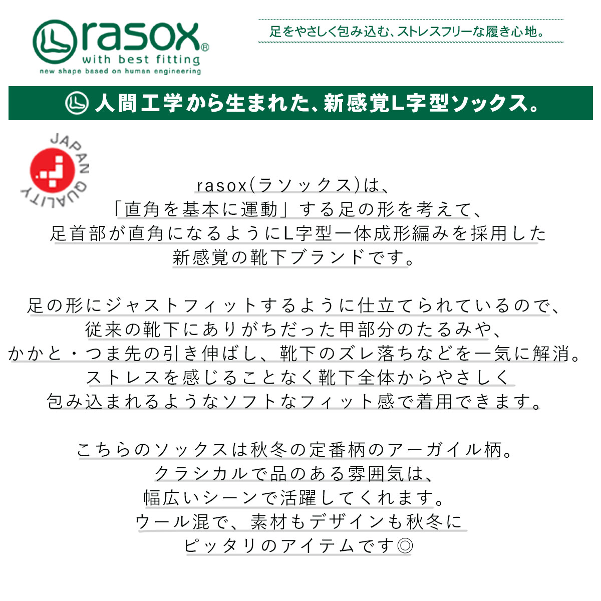 生産国 日本 素材 毛、ナイロン、その他 ⇒rasoxソックス一覧はこちら サイズ S 22〜24cm M 24〜26cm L 26〜28cm ギフト対応rasox(ラソックス)は、 「直角を基本に運動」する足の形を考えて、 足首部が直角になるようにL字型一体成形編みを採用した 新感覚の靴下ブランドです。