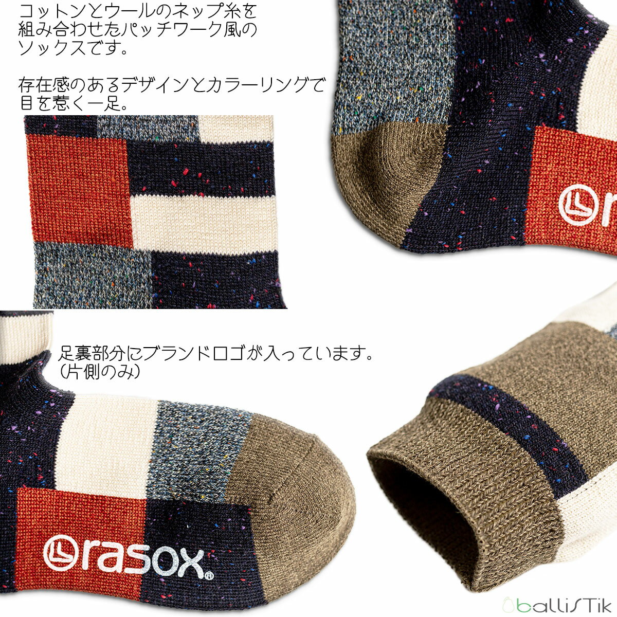 rasox ラソックス L字型靴下 クルーソックス パッチワークコットン CA202CR20 【ネコポス(メール便/ポスト投函)のみ送料無料(代引,あす楽,日時指定不可)/無料ギフトラッピング】 ・コットンとウールのネップ糸を組み合わせたパッチワーク風のソックス。